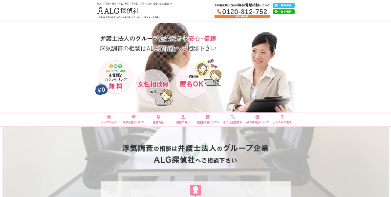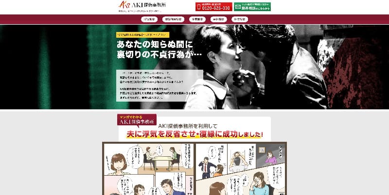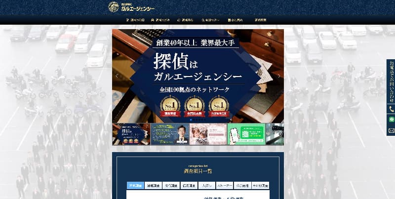 | 調査項目 | 浮気調査・不倫調査・家出調査・素行調査・人探し 結婚調査・企業調査・詐欺調査・ストーカー調査・盗聴盗撮調査等 |