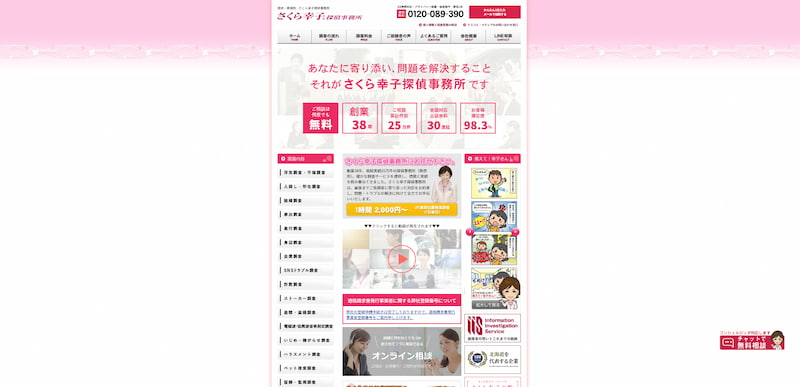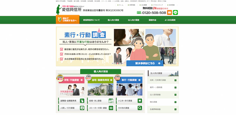 | 調査項目 | 浮気・不倫調査、家出・行方調査、結婚信用調査、素行調査、企業・個人信用調査、盗聴発見調査、ストーカー・嫌がらせ調査 など |